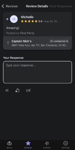 Mit der mobilen App von Yext können Sie Bewertungen überwachen und beantworten. Die App unterstützt Freitext, Bewertungsantwort-Elemente, eingebettete Felder und generative Bewertungsantworten.