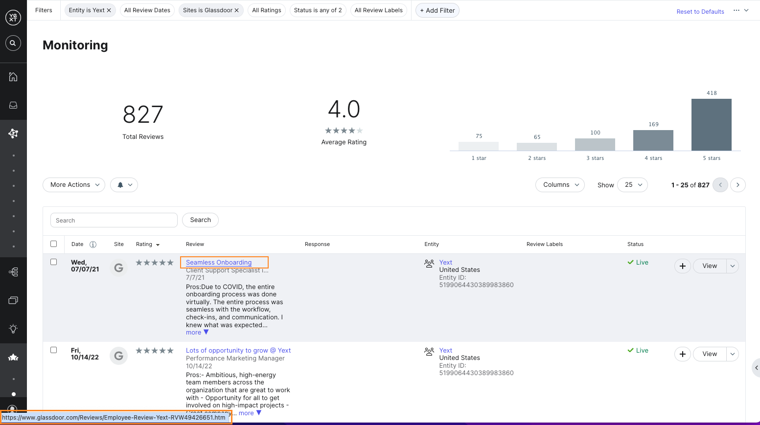 Once these steps are complete, Yext begins scanning for reviews. When reviews first appear, validate that the Brand entity has been matched to the correct listing by clicking through to the review and confirming it leads to your brand's page on that publisher.