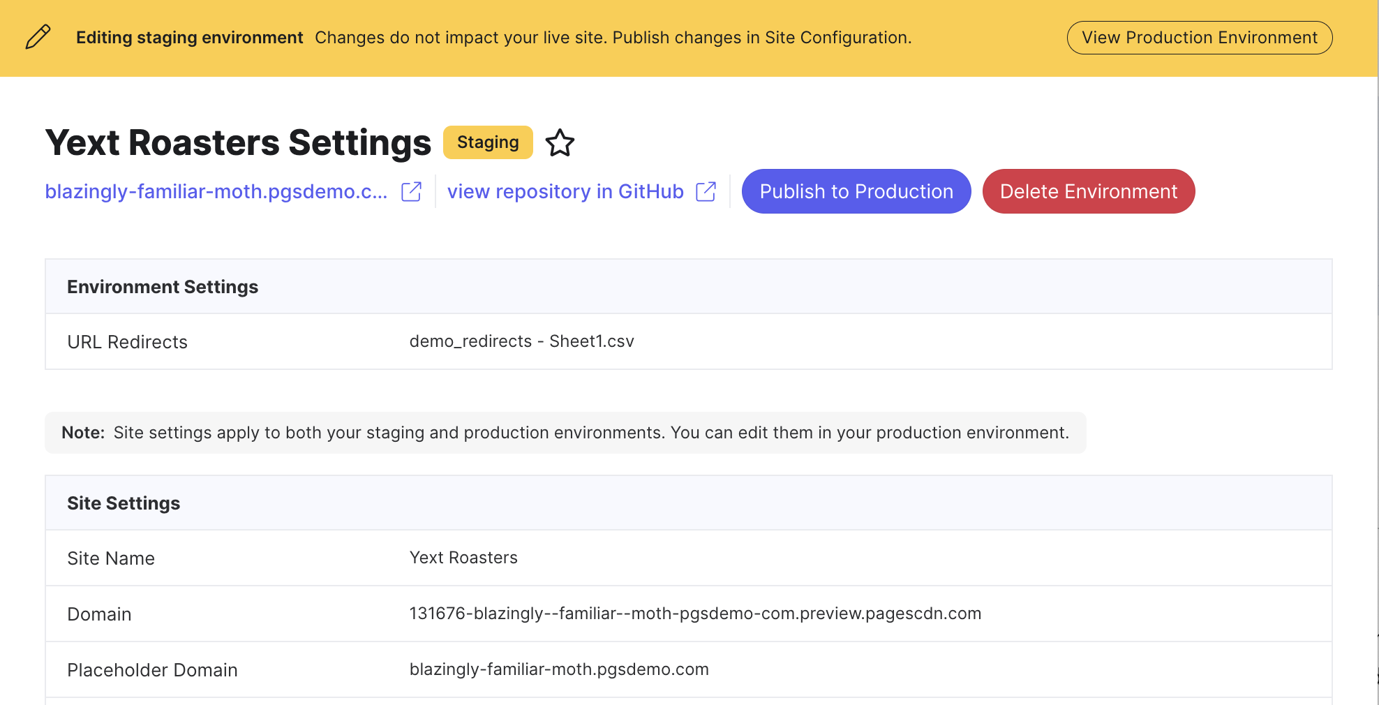 Important: This action completely replaces your existing production site with the staging environment content and cannot be undone. Publishing to production also deletes the staging environment — you'll need to create a new one if you want to use staging again.