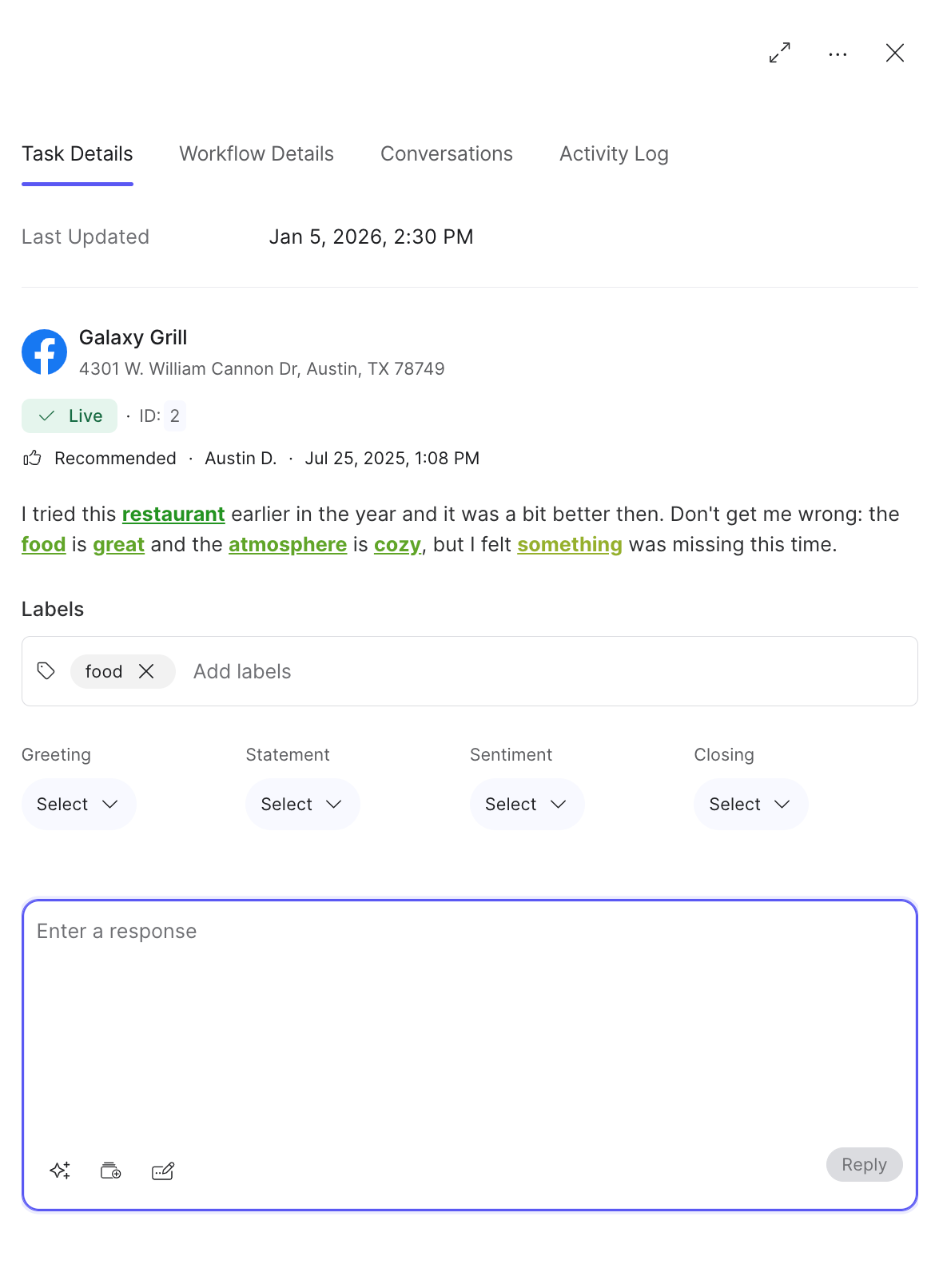 When an assignee clicks into a Review Response task, they will see the original review along with Labels and Response text boxes that they can update.
