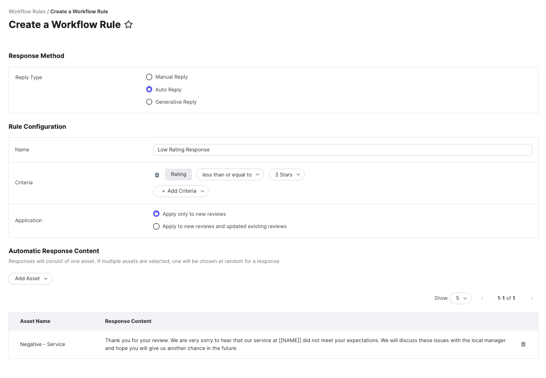 - Auto Reply. The workflow uses pre-approved text assets to respond to the review automatically.