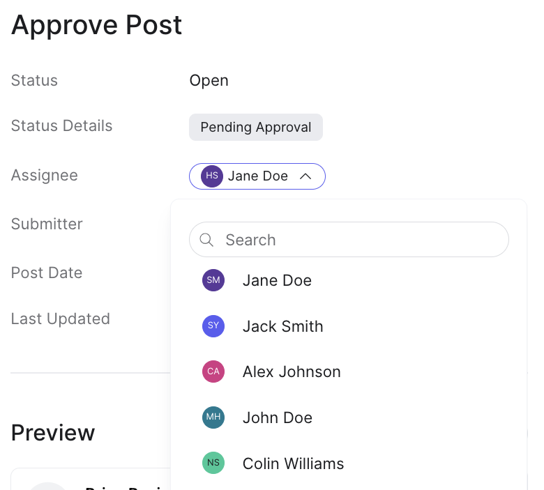 Assignees are “Unassigned” by default, and an assignee can be specified. Setting an assignee ensures that the right and relevant person is accountable for approvals, reviews, or edits. These users will also be the individual who receives task notifications.