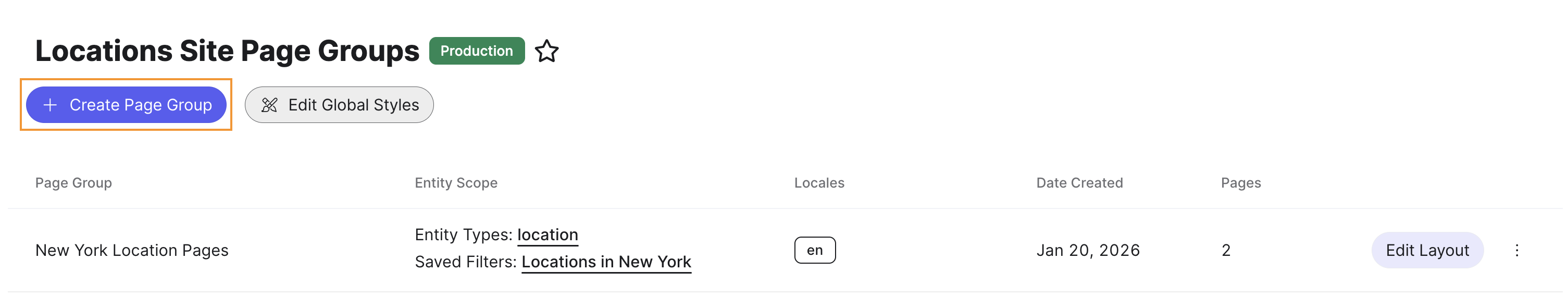 Tip: If you're creating a page group based on an existing one — such as intent pages or coming soon pages — duplicate an existing page group instead of starting from scratch. Duplication carries over the entity scope and full layout. See Create Intent Pages and Create Coming Soon Pages for step-by-step workflows.
