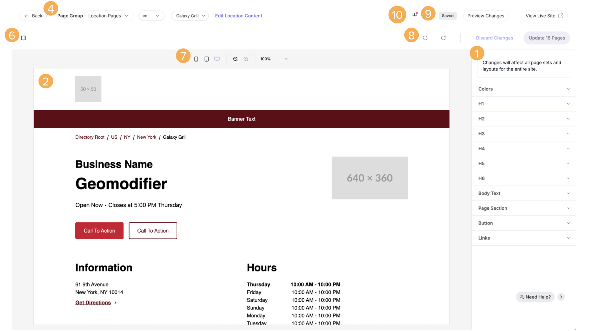 - Click Publish in the change controls (8). If your pages are already live, this button reads Update # Pages.