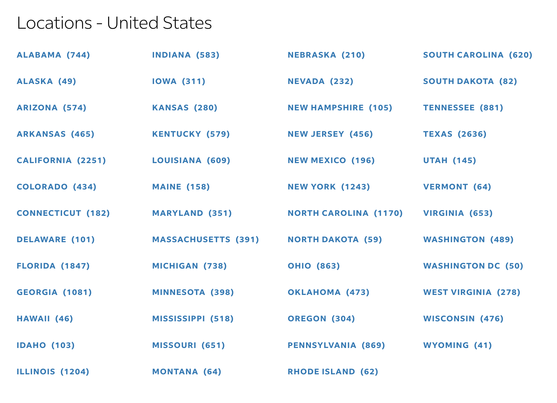 - Each country page lists regions (for example, US states) with locations.
