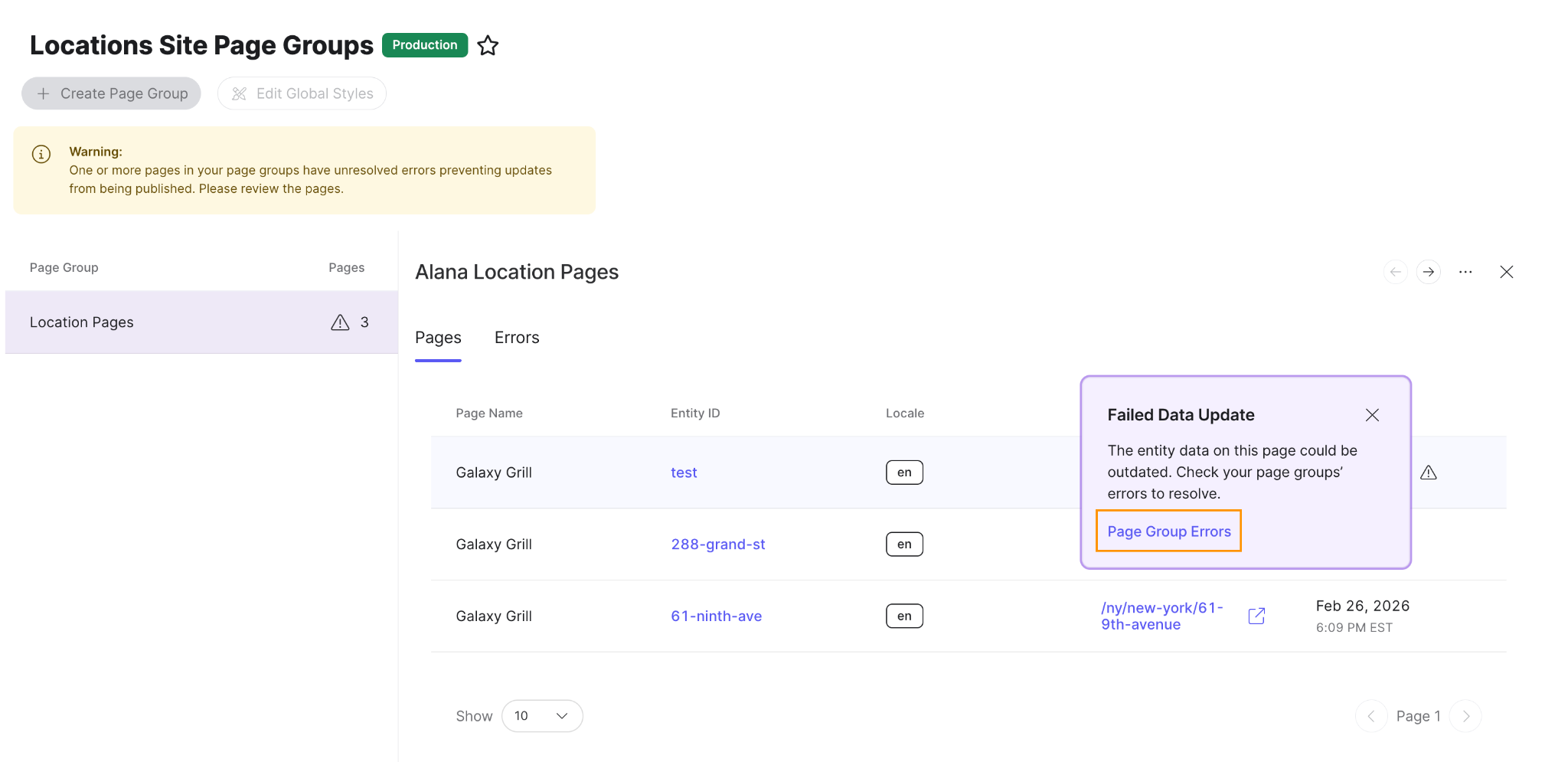 Important: If a page group has an active error or warning, you cannot edit global styles, edit layouts, or add new page groups until it is resolved. You can still edit the page group's entity scope, which will trigger a redeploy, or manually redeploy the site yourself.