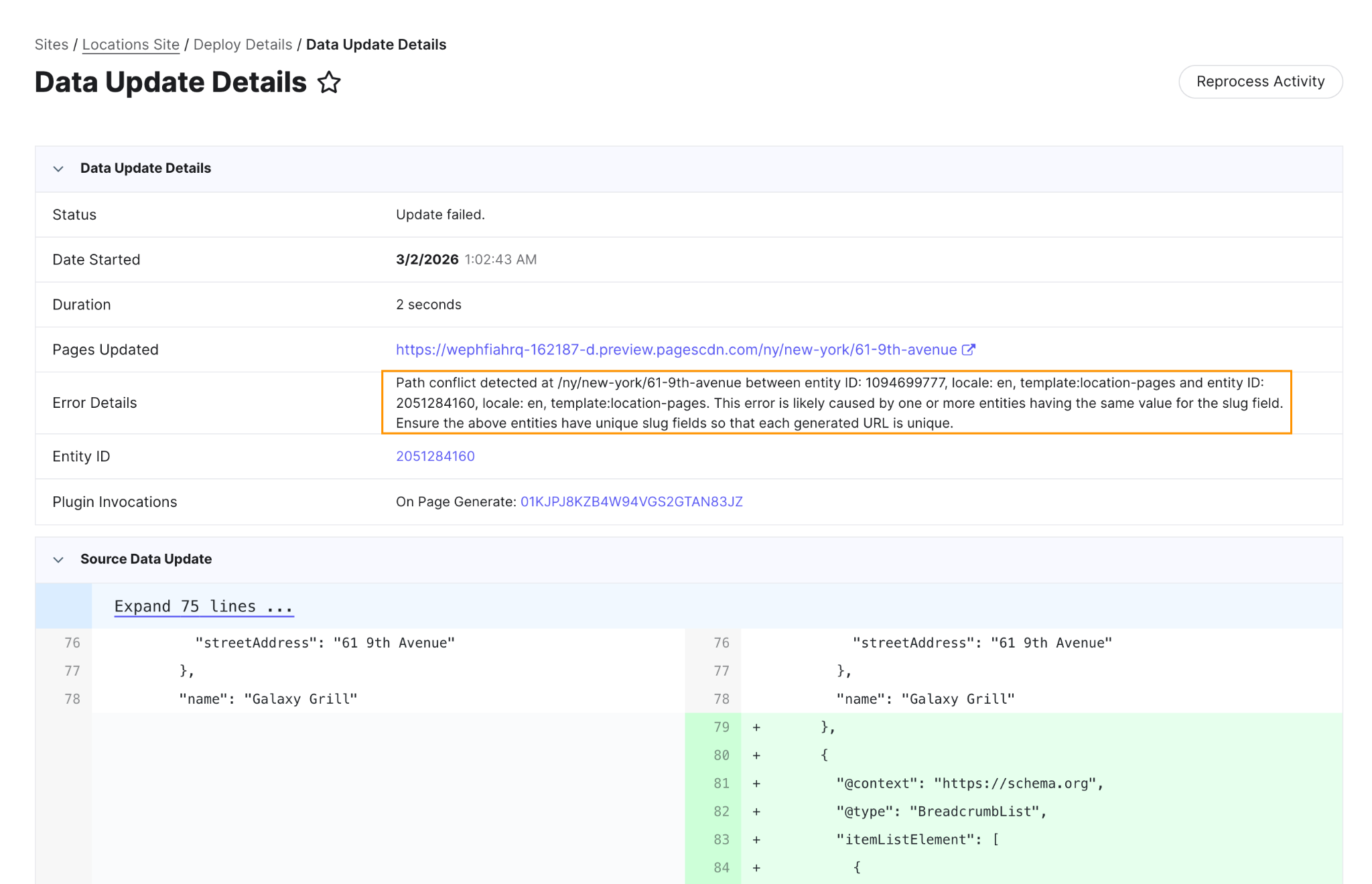 How to find it: On the Pages tab, click the warning icon and open the Page Group Errors link. The Error Details section identifies which entities have conflicting slugs and the Source Data Update section shows what data change triggered the error.