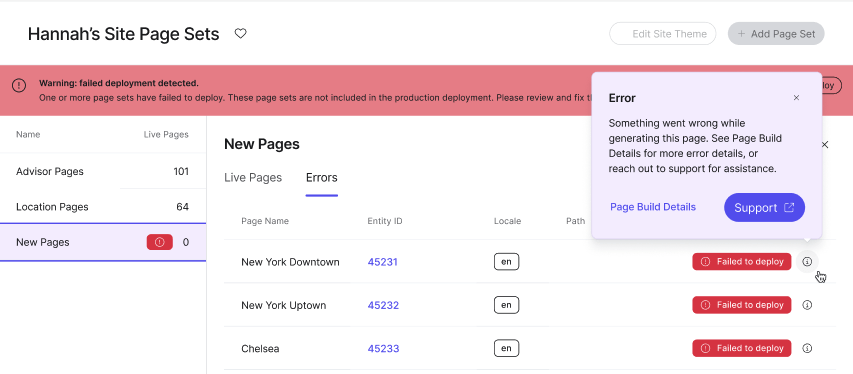 How to fix it: Check one thing before contacting support. Each entity can only generate one page per site. If your page group scopes overlap, review and adjust the saved filters on each page group so they don't include the same entities. If the error persists after ruling this out, contact your account team for support.
