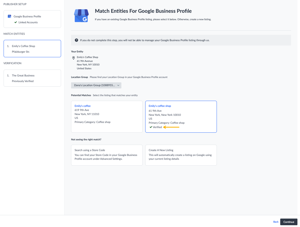 - Si el local está verificado, haz clic en Continuar. De lo contrario, sigue los pasos de verificación que se indican a continuación.