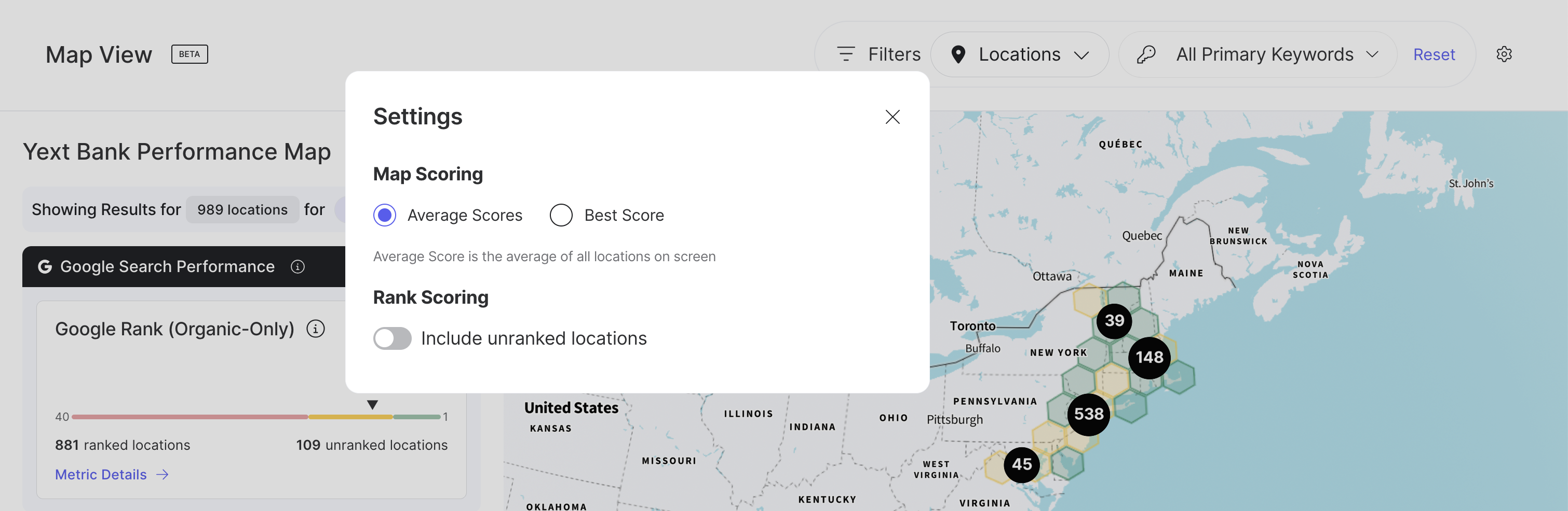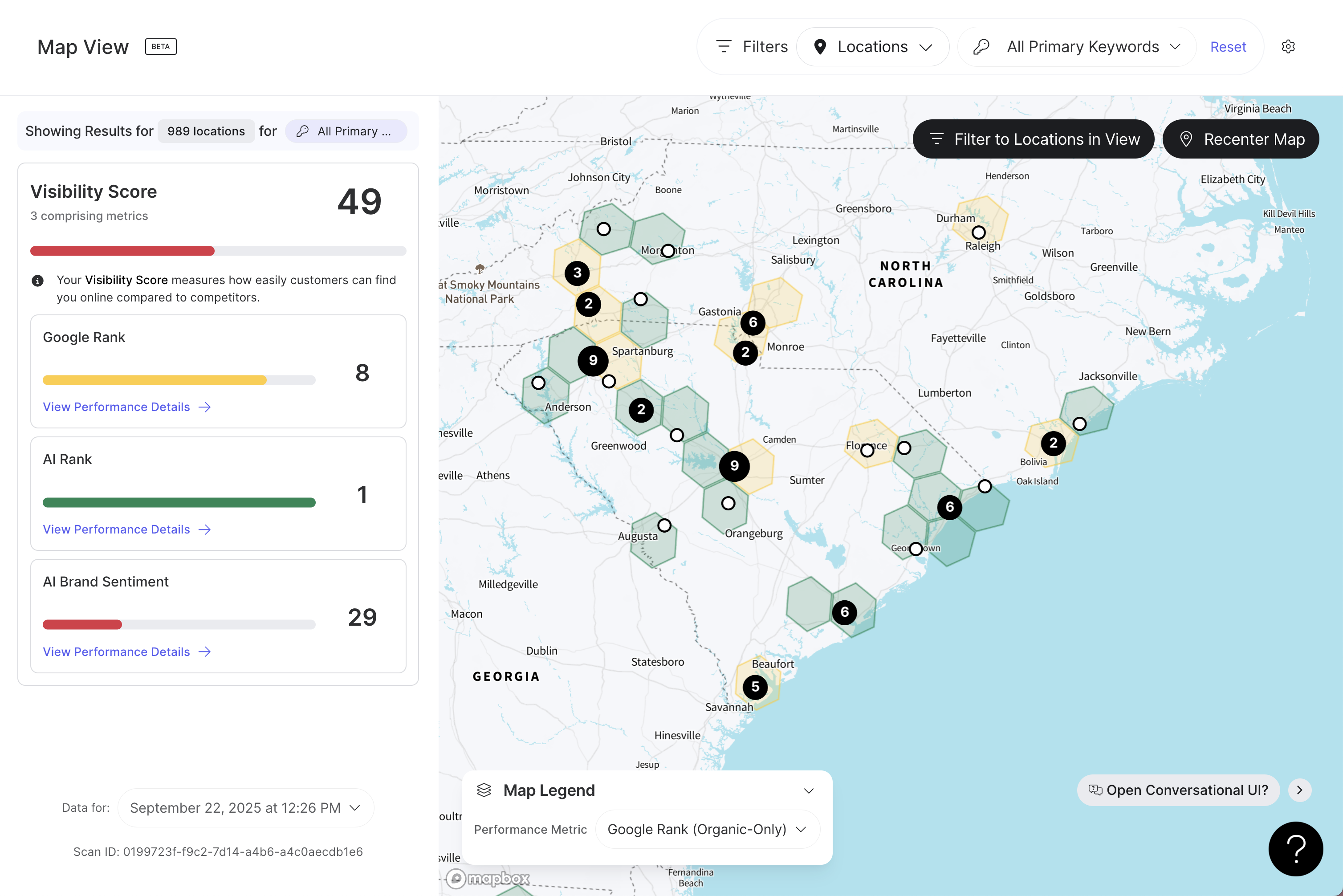 Chaque hexagone représente un segment de la carte avec au moins un établissement (épingle), et vous pouvez cliquer sur un hexagone ou une épingle pour filtrer les données afin de n'afficher que le ou les établissements sélectionnés. Si un hexagone inclut plus d'un établissement, le chiffre apparaît à côté du point noir lorsque vous effectuez un zoom arrière. Chaque hexagone répond à un code couleur selon le statut de l'indicateur sélectionné. La mesure par défaut est le classement Google, mais vous pouvez la modifier dans le menu déroulant en bas de la carte.