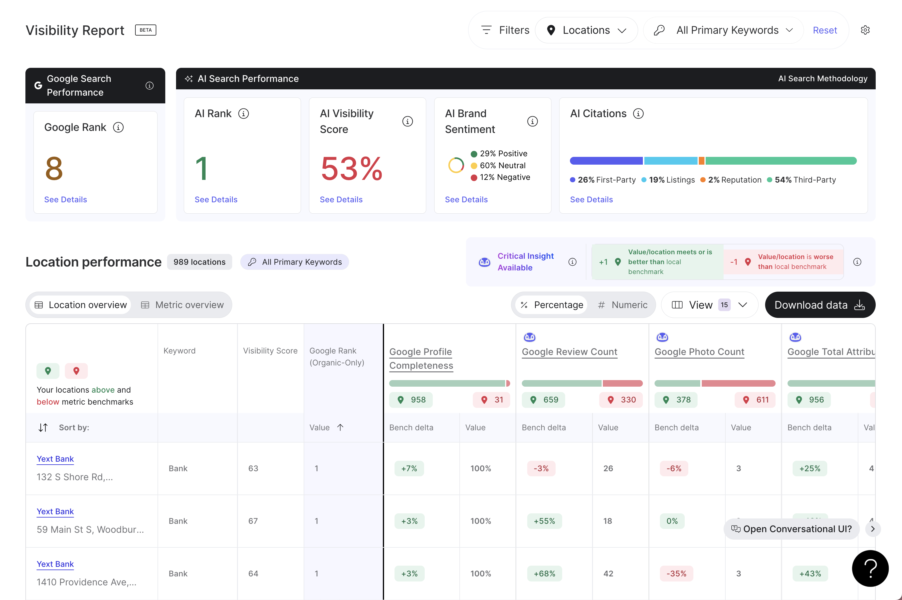 Votre rapport de visibilité fournit plusieurs indicateurs clés concernant la visibilité, le sentiment et les performances de recherche de votre marque. Vous pouvez voir le rapport à côté d'une vue de carte interactive ou sous forme de rapport complet. De plus, vous pouvez obtenir des idées exploitables sur comment améliorer vos métriques.