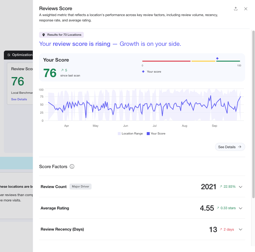 Ora puoi visualizzare maggiori dettagli sul punteggio delle recensioni, incluse le tendenze nel tempo, le sede con le migliori e peggiori prestazioni e i fattori di punteggio. Per vedere le informazioni, fai clic su Vedi dettagli nel riquadro del punteggio della recensione nella vista mappa o resoconto.