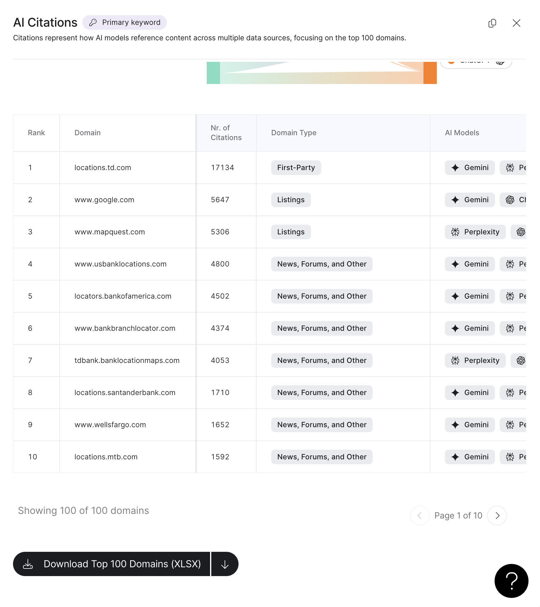 La lista delle citazioni IA in-platform ora si concentra sui primi 100 domini. In questo modo si riduce il rumore evidenziando le fonti più significative che fanno riferimento al tuo brand nella ricerca IA.