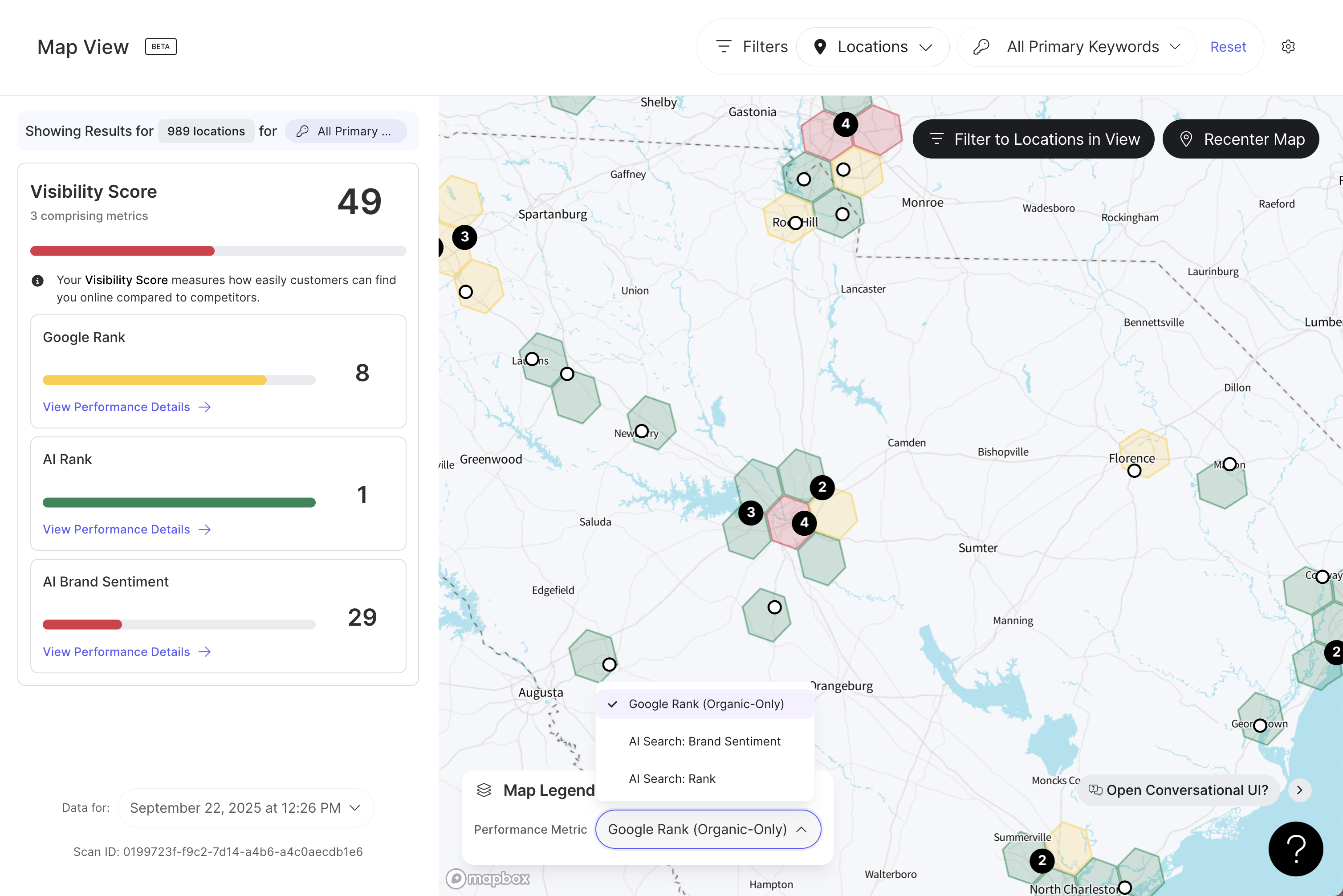 マップビューでは、ロケーションを視覚的に操作したり、拡大縮小して地域ごとのさまざまな傾向を確認したりできます。マップに表示されているロケーションに基づいて、可視性レポートの指標が左のサイドバーに表示され、地図の移動に応じてリアルタイムで更新されます。そのため、ズームアウトすれば、州全体、地域全体、あるいは国全体の指標を確認することができます。ズームインすれば、都市や地域、あるいは特定のロケーション単位で指標を確認できます。