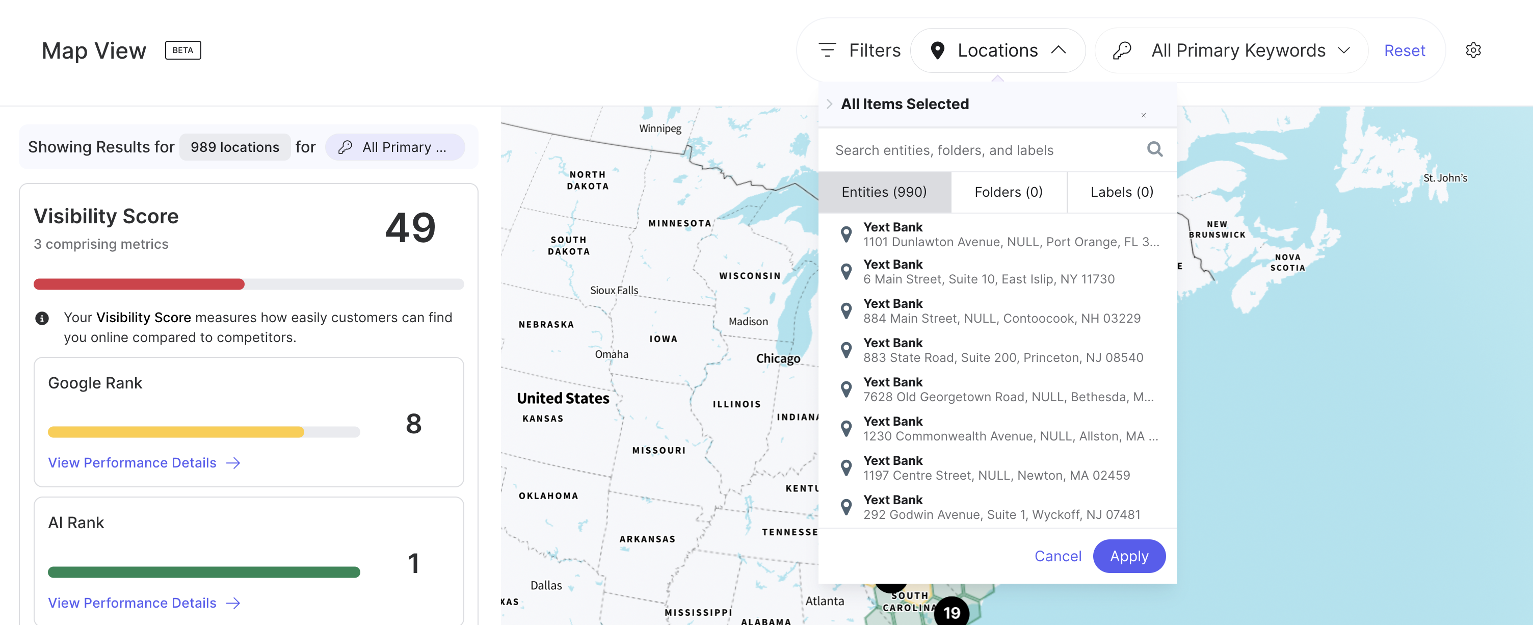 可視性レポートでは、ブランドの可視性、感情、検索パフォーマンスに関する主要な指標を確認できます。このレポートは、インタラクティブなマップビューと並べて表示することも、全画面のレポートとして表示することも可能です。さらに、指標を改善するための具体的なインサイトも得られます。