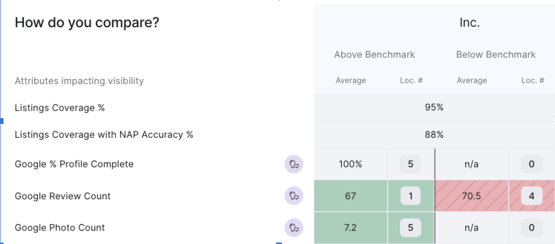 ベンチマークは、各ロケーションのローカル市場平均によって設定されます。このため、ロサンゼルスのようなレビュー件数の多い市場のロケーションでは、レビュー数が多くても「ベンチマークを下回る」ことがあります。一方で、サクラメントのようなレビュー件数が少ない市場のロケーションでは、少ないレビュー件数で「ベンチマークを上回る」ことがあります。その結果、「ベンチマークを下回る」グループの平均が「ベンチマークを上回る」グループよりも高くなる可能性があります。