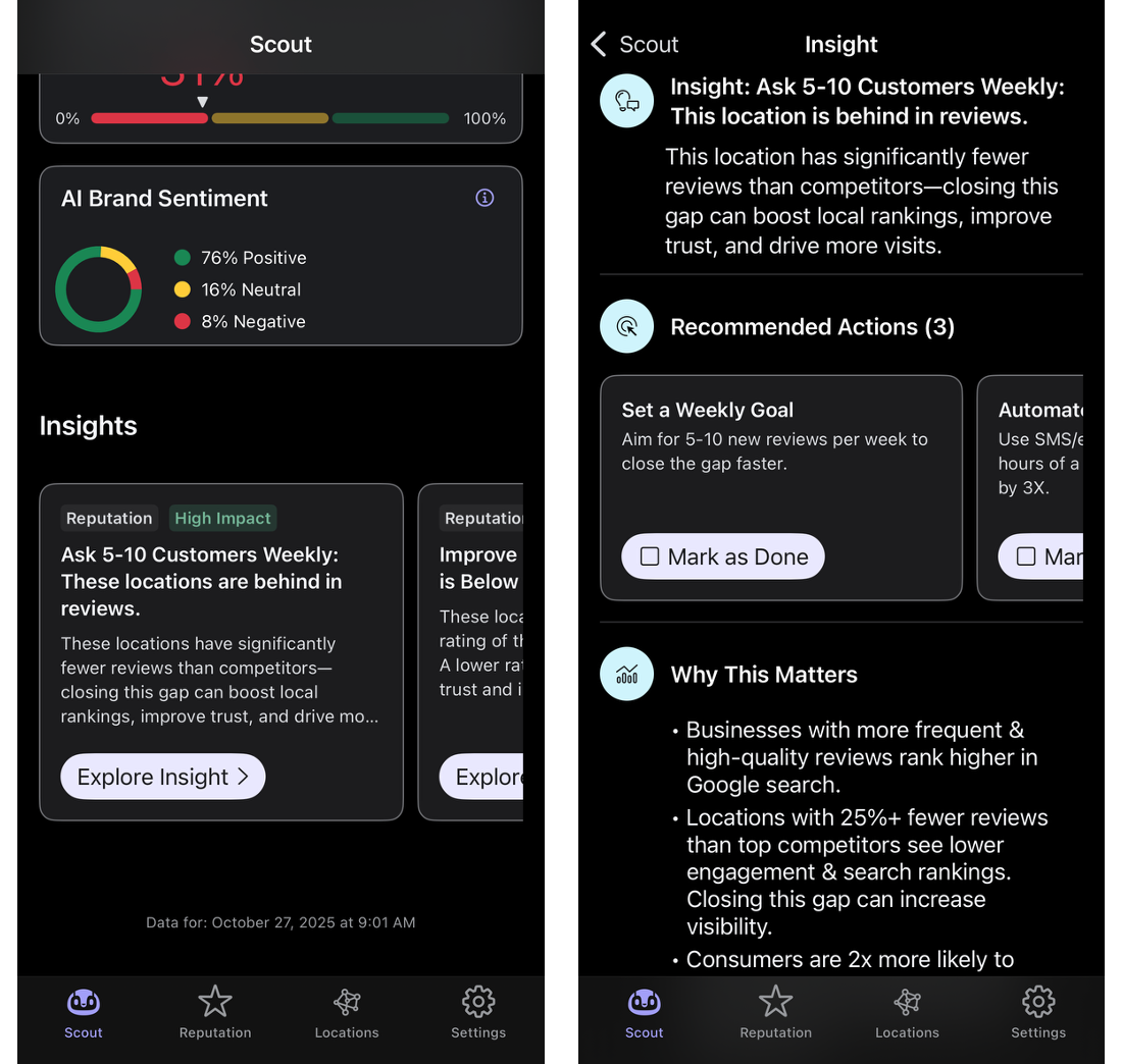 Scoutは、ブランドのパフォーマンスや発見されやすさを分析するツールです。Scoutを使えば、GoogleやAI検索結果でのローカル競合との比較ランキングを確認でき、ブランドに対する感情の傾向を素早く把握し、ブランドの可視性を高めるための有益な推奨事項を得ることができます。